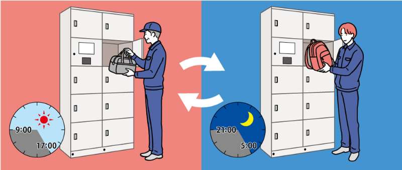 学校や出張先のオフィスなどで必要な物品を安全に管理・貸出できる仕組みです。あらかじめロッカーに決まった物を収納し、利用者(例:Aさん)を登録することで、Aさんは認証後にその物を取り出せます。これにより、物品の受け渡しをスムーズかつ確実に行うことができます。